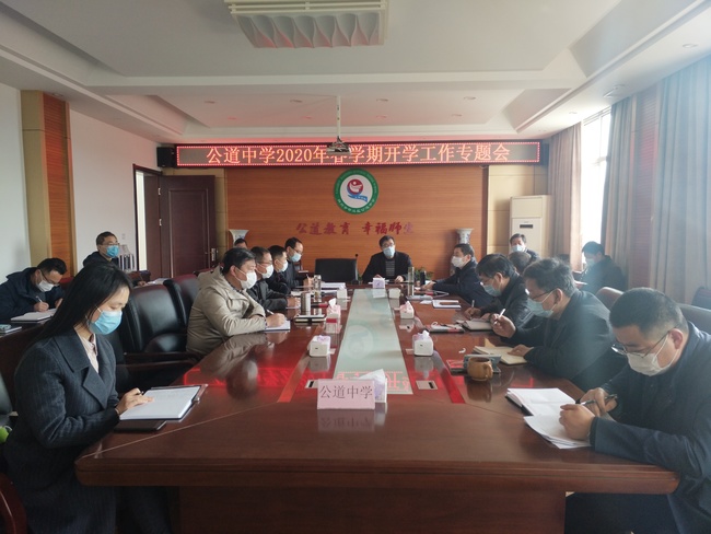 3月23日上午,公道中学召开2020年春学期开学工作专题会,对新学期开学准备工作进行部署。会议由公道中学沈文涛校长主持,学校全体行政人员参加会议。