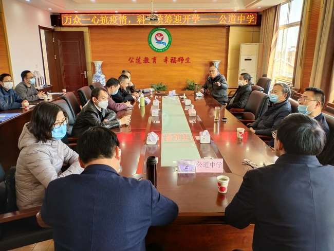 在公道中学宜思楼四楼会议室,学校沈文涛校长以《万众一心抗疫情,科学统筹迎开学》为主题的简要汇报,近期学校关于疫情防控和校园安全等开学准备工作,针对3.25区督查组所提出的问题与建议,学校已采取措施进一步完善材料、改进工作等,以及目前疫情条件下出现的新问题、新挑战等。