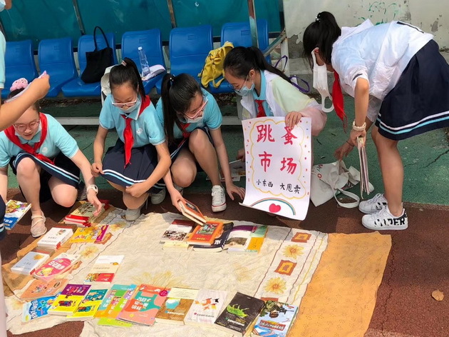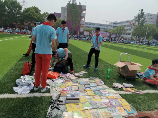 义卖的物品主要是孩子们看过的书籍、用过的文具。一大早,义卖的摊位便沿着操场摆开了,孩子们自制的各式促销广告牌很是吸引人的眼球,清脆响亮的叫卖声也是此起彼伏,有的孩子甚至当场演奏乐器,来招揽“顾客”。一到五年级孩子们则在大队部的统一安排下,分批入场。义卖现场热闹却不拥护,忙碌而又秩序井然。 |