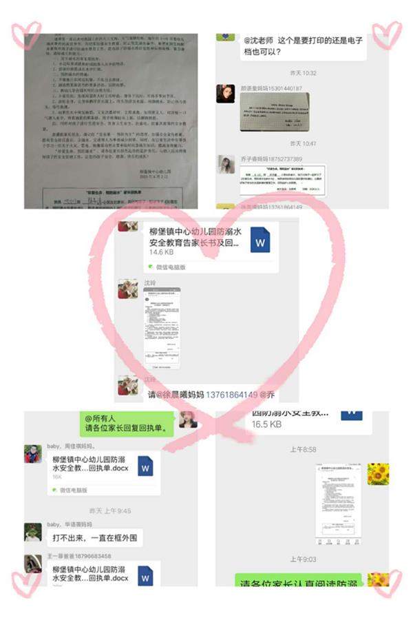 活动中,各班老师利用多媒体课件、图片、儿歌、家教园地等,让幼儿了解易发生溺水事故的危险地带,并认识防溺水的标志;同时向家长发放《珍爱生命、预防溺水》告家长书,并收回回执单(对未入园孩子的回执单进行电子截屏);还利用微信群,提醒家长在家加强对孩子看护,提高家长对“防溺水”安全警惕性,增强家长对孩子的安全保护意识。