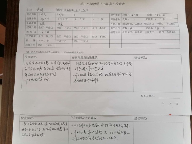 杨庄小学一直注重教学常规工作,开学以来按照学期工作计划进行教育教学工作。本周是“七认真”检查周,周一政治学习时,教导处发放杨庄小学教学“七认真”检查表,由各位任课教师自检并填写。6月4日、5日,语文组、综合组和数学组、英语组老师分别将“七认真”资料送会议室。教导处组织人员进行检查,填写好检查简评,指出存在问题,提出改进建议,最后给出建议等次。教导处将根据检查结果,与当事老师一起进行总结、整改。