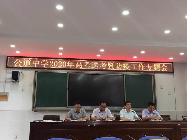 会议首先由高三年级负责人李兆兵副校长介绍了本次高考送考工作的特殊性,强调本次送考工作的重要性,明确本次送考工作的责任性。其次由高三年级主任王忠祥老师宣读《公道中学2020年高考送考方案》,并根据学校实际情况和今年防疫的特殊现状,结合学校多年来的送考经验,对各位送考教师提出具体送考要求,明确学生考试期间相关要求、班主任送考要求及学生考试注意事项,特别强调疫情期间送考工作的具体布置,分工到位,责任到人。