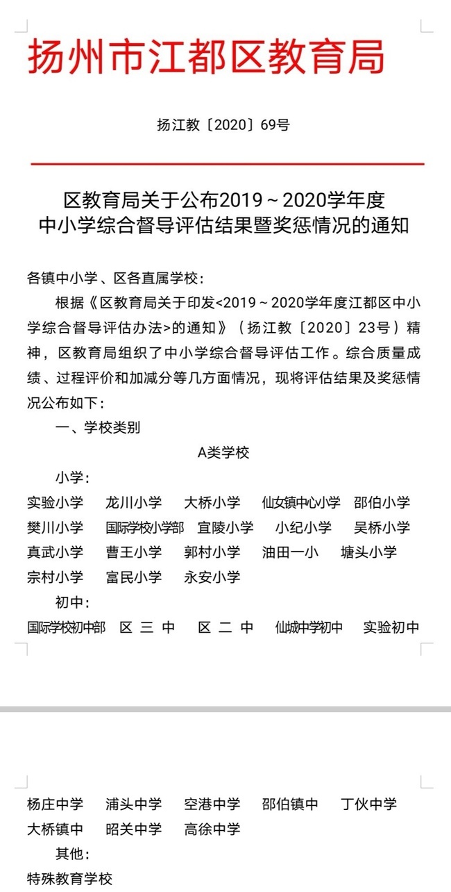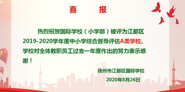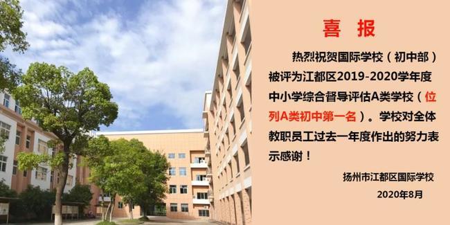 【喜报】热烈祝贺国际学校初中、小学分别被评为江都区2019-2020学年度中小学综合督导评估A类学校