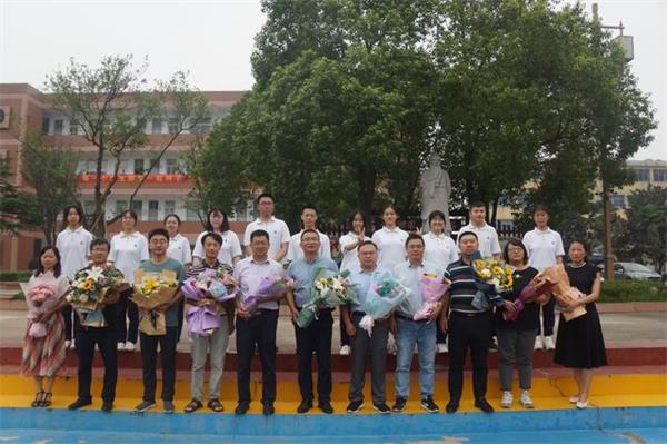 接着,德育处杨正海主任宣读了《关于表彰担任班主任15年以上的现职班主任的决定》,校党总支书记、副校长李兆兵为获奖班主任朱爱莲和范秋盛两位老师颁奖。操场顿时掌声雷动,学生们发自内心的掌声代表着他们的敬佩和尊重之情。光阴15载,无数个日日夜夜,他们承载着无数的光荣与梦想,他们承载着多少莘莘学子的期待和渴望,他们承载着多少家庭的期盼和嘱托。受表彰的两位班主任是公中班主任团队的优秀代表,像他们这样扎根于公中这片热土默默奉献和耕耘的优秀班主任还有很多很多,公中的每一位班主任背后都有许多感人的教育故事。随后,各班班干部代表向老师献花并送上祝福,全体高一同学还带来了手势舞《听我说谢谢你》。虽然话筒前的班干部代表们还有些许紧张,虽然少数同学的手势舞还不是那么娴熟,但是他们的真诚和无邪打动了在场的每一位老师。眼前的不仅仅是学习勤奋努力刻苦的孩子,而且还是懂得感恩并能落落大方地表达出他们感激之情的孩子。此刻的他们正是 “立德至公,大道树人”的教育理念的完美诠释。