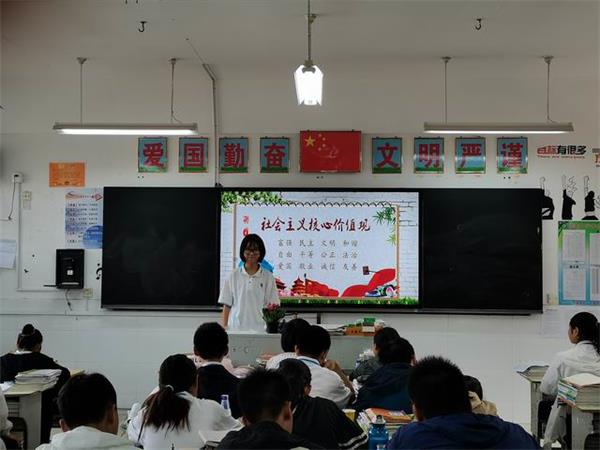 二、国家放心中,己任放肩头。少年强则国强,青少年的健康成长牵动着千家万户的心,更有着党和政府的殷切期望。帮助青少年“扣好人生第一粒扣子”,培育和践行社会主义核心价值观是每一位教育工作者应尽的职责。通过本次主题班会活动,学生们知晓了自己的责任和要求:心中有国家,肩上负己任,奋力学习,报效祖国。