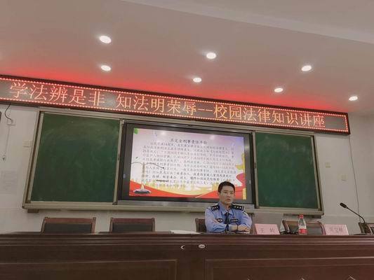 王岭副所长从以下几个问题切入:你们在低头奋斗时,是否抬头看一看身边的社会现状?你们有没有意识到安全的重要性?有没有思考过社会的安全问题?有没有了解过安全防范的知识?对法律是否敬畏是否了解?随后,他从法律责任、责任年龄、违法犯罪、防范四个方面对学生进行详细而又生动幽默的法律知识阐述。