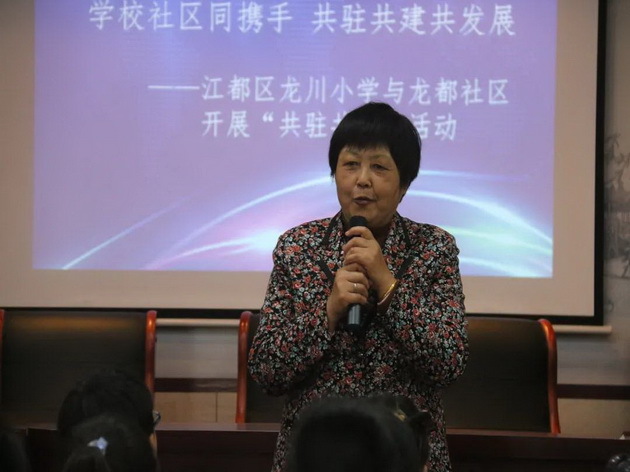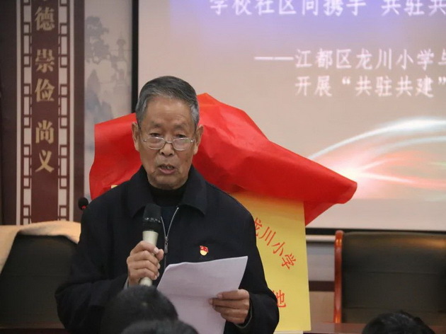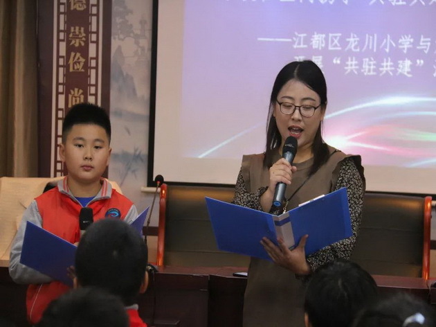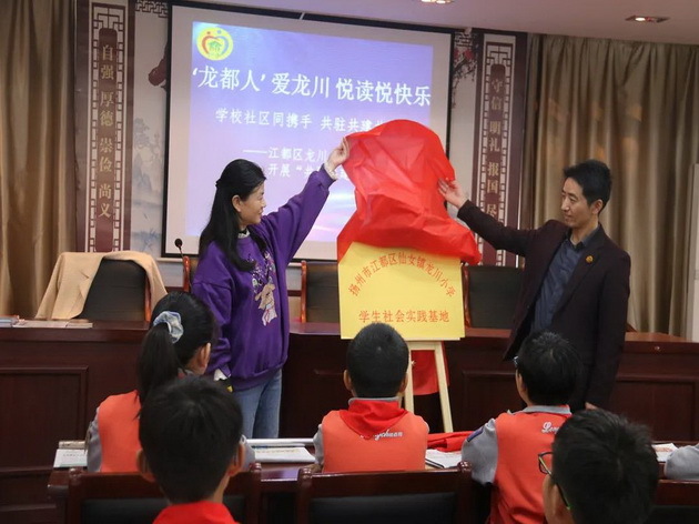 师生们首先参观了龙都社区新时代文明实践站,龙都社区整洁有序的阅读书吧彰显着浓郁的读书氛围。在龙都社区的会议室里,龙都社区胡红霞书记、龙川小学梁文强主任共同为“扬州市江都区仙女镇龙川小学学生社会实践基地”揭牌;五(1)中队杨辰逸家庭的亲子朗诵让人感受到书香家庭的韵味;社区居民、退休职工万大妈,老党员向书记以自己的生活、工作经历勉励龙川学子热爱祖国、热爱生活、用心阅读。最后,由社区胡书记、万大妈、老党员向书记以及部分龙川学子共同合唱的《我的中国心》将阅读分享推向了高潮。