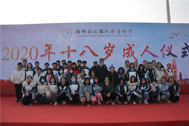 12月12日下午,育才中学全体高三师生齐聚学校操场,举行主题为“迈入成人门,走好人生路”的十八岁成人仪式。江都团区委、教育局团委领导,辖区民警以及全体高三家长应邀出席仪式。