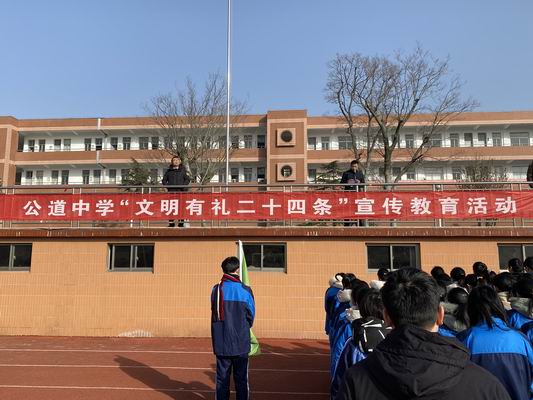 为了进一步提升学生身心素养,争做一名合格的文明校园学生,1月12日上午,公道中学德育处在校长室的统筹领导下,杨正海主任主持了“文明有礼二十四条”宣传教育活动。