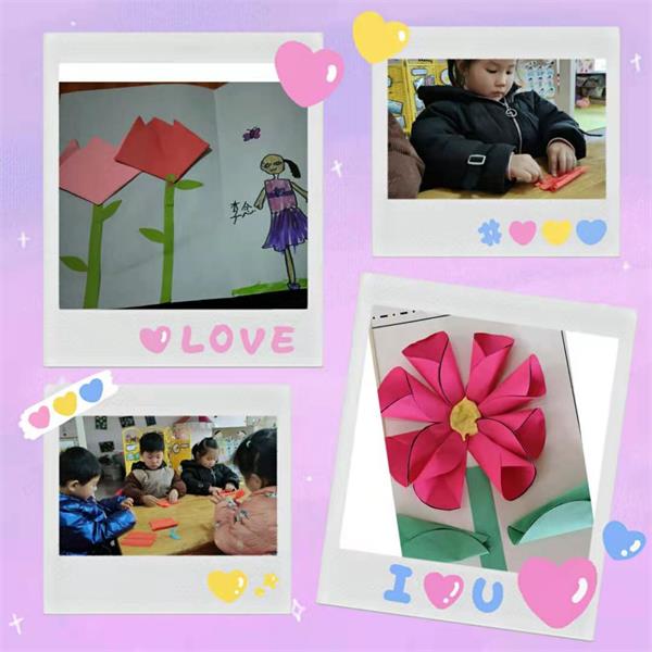 活动中,孩子们都是能工巧匠。小班的孩子们,在老师的帮助下,亲手做了“一朵小红花”,将这个充满亲情的“小红花”亲手送个妈妈(奶奶),并说句甜甜的话。中班的孩子们个个认真地做了“美丽的花”送给妈妈(奶奶),然后给妈妈(奶奶)唱一首好听的歌曲。大班的孩子们精心的为妈妈(奶奶)折了一朵“郁金香”,并要求回家帮妈妈(奶奶)做件力所能及的事,送一句最开心、最幸福的节日祝福等。