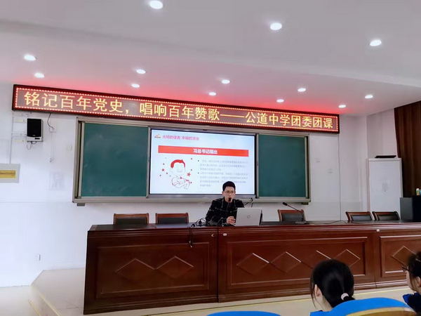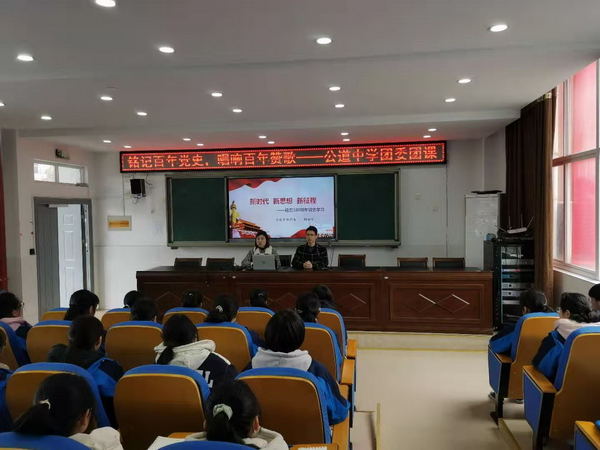 3月19日,公道中学团委在毓贤楼一楼多功能教室组织了“铭记百年党史,唱响百年赞歌”党史学习活动。会议由公道中学团委副书记崔婷主持,公道中学思政课老师韩拓宇给所有高一团员和高一高二入团积极分子开讲第一课。