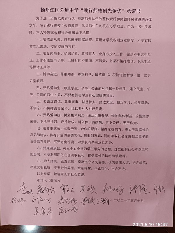 为了进一步规范教育行为,提高师资队伍的整体素质和师德师风建设的总体水平,践行公道中学“公道教育,幸福师生”的核心办学理念,学校全体教师集中学习了相关的法律法规,并且向家长和社会做出了践行师德创先争优的承诺。