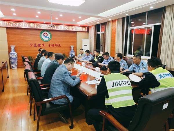 当晚9点,在学校宜思楼会议室,学校盛传云副校长就本次警民联合交通巡查活动进行工作布置。公道交警中队副中队长刘爽、公道派出所副所长王岭等9名警官,公道中学校长办、德育处、年级组、总务处等部门精心挑选了15名老师参与此次活动。