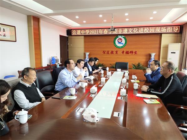 随后,冯长宏副局长等在学校宜思楼四楼会议室落座,大家就非遗文化进校园和校园文化建设作了深度交流。田宗祥主任建议,在学校现有多元文化并存的基础上,综合提炼,整体设计,彰显特色,融合推进,将校园文化融为一个整体。冯长宏副局长进一步指出,在给学校文化筑根提魂的同时,以点线面的方式,校园整体布局科学设计,区域功能要更加明晰。提升,应注重对地域文化(公道文化、阮元文化等)深度开发,借助于专家的先进思想、理念,挖深研透,形成学校的特色,打造“公道教育”的品牌。