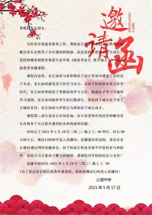 为强化家校合作基础,深入推进新家庭教育,引导家长积极参与新家庭教育培训,不断提升家长自我教育管理水平,促成家校合力,共同培育优秀公中学子,5月17日,公道中学特邀善朝教育集团专家线上开展《做优秀家长 度幸福人生》教育专题讲座,并向全校学生家长发出邀请函。