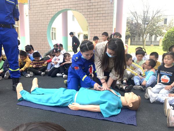 活动最后消防员姐姐对老师系统全面讲解应对此类状况时所采用的急救手法——胸外按压、人工呼吸以及海克立姆急救法,并现场教学。