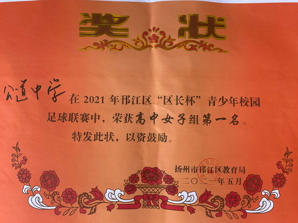 2021年5月29日,在邗江区2021年“区长杯”高中组足球比赛中,公道中学喜获女子组冠军、男子组季军的好成绩。