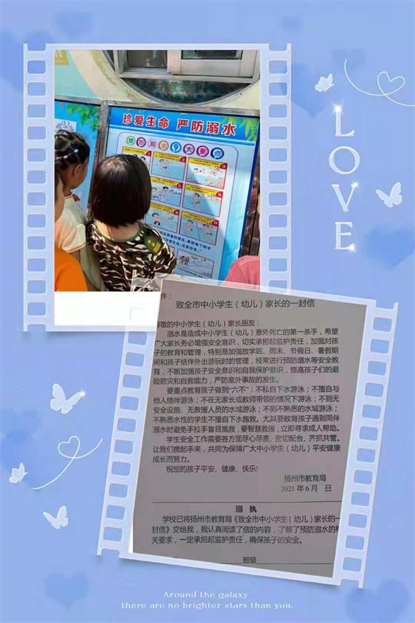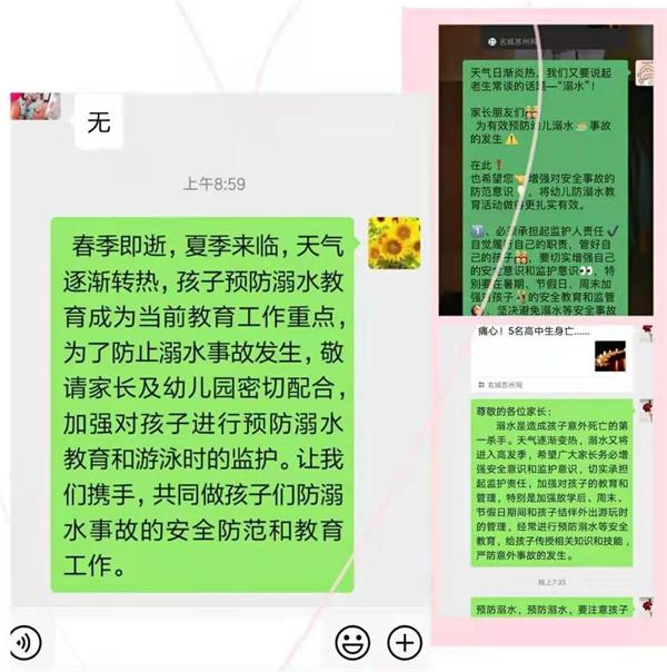 与此同时, 家园配合保安全。该园通过家园联系栏、班级Q群、微信群及发放关于防溺水的《致家长的一封信》并签订已阅回执单等各种渠道向家长宣传安全知识,帮助家长增强安全意识和监护意识,切实承担起监护责任,加强对幼儿的教育和管理。特别是加强离园、周末、节假日期间请家长重视幼儿溺水事件,加大对幼儿的监护、看管力度,尽量不要让幼儿离开自己的监护和视线范围,杜绝幼儿意外伤害事故的发生。