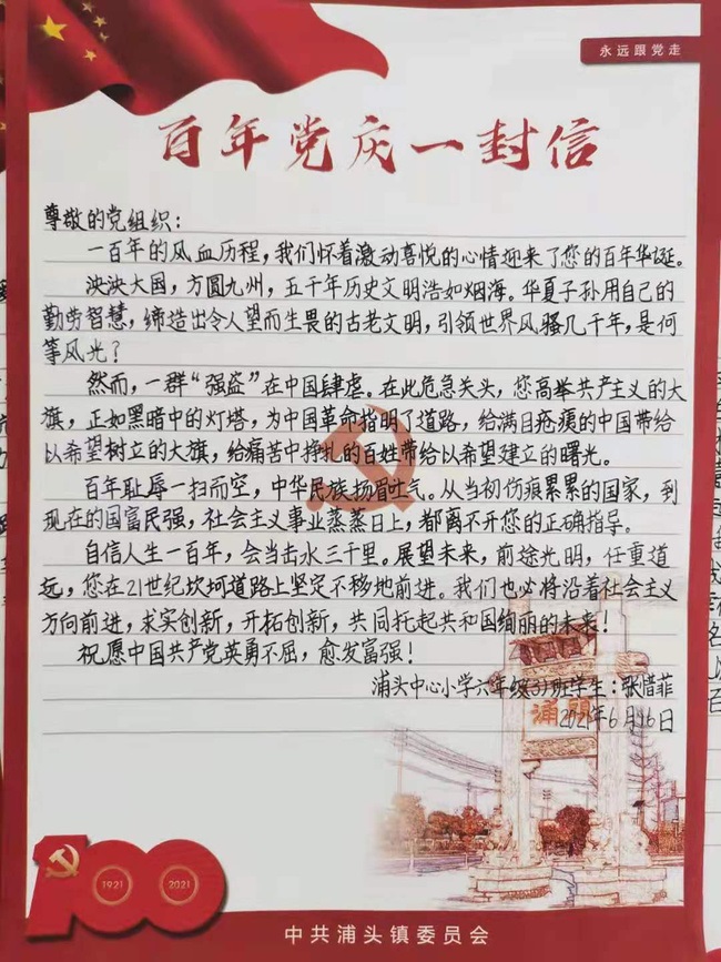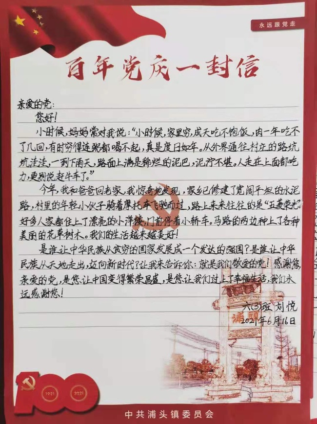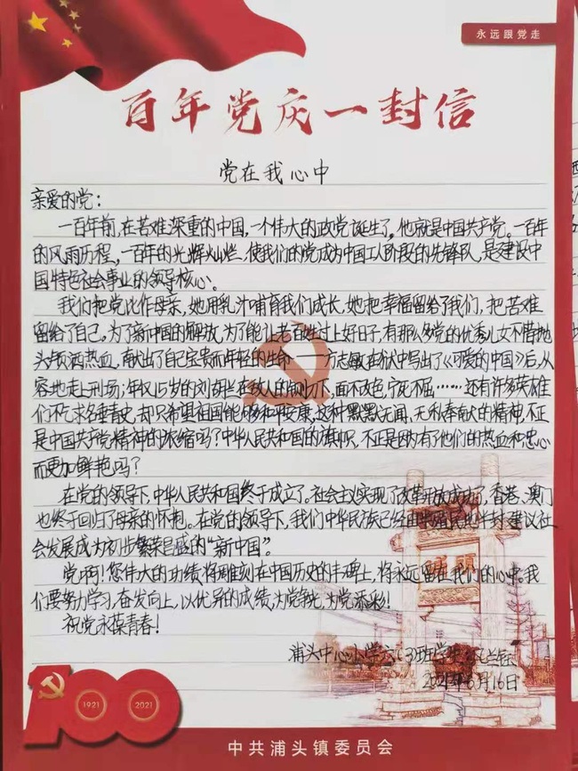 在党的百年华诞即将到来之际,日前浦头小学工会和大队部在广大师生中开展"百年党建一封信”活动,引导广大师生把想对党说的话通过写信的方式表达出来。