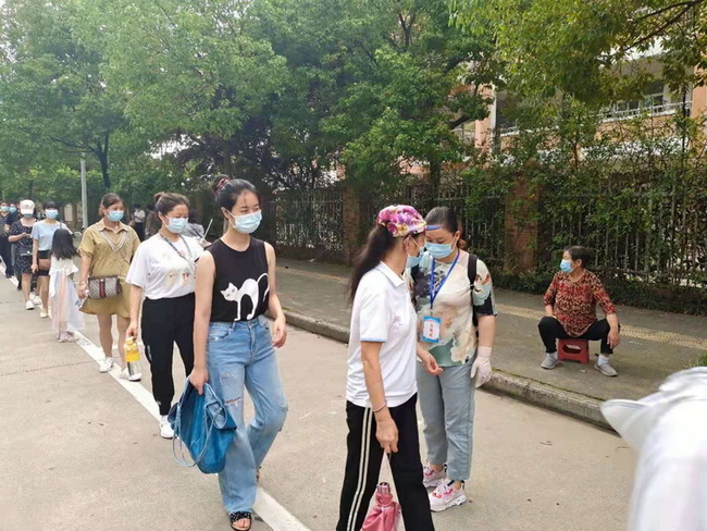 8月3日下午,江都区启动了全员核酸检测,龙川小学一百多名志愿者再次闻声而动,来到了李坝社区检测点参与工作:维持现场秩序,给居民测体温,不时地提醒人们保持好安全距离,指导群众准备好苏康码、行程码、预约码,不少老年人还需要帮忙注册预约码……志愿者们忙得不可开交。