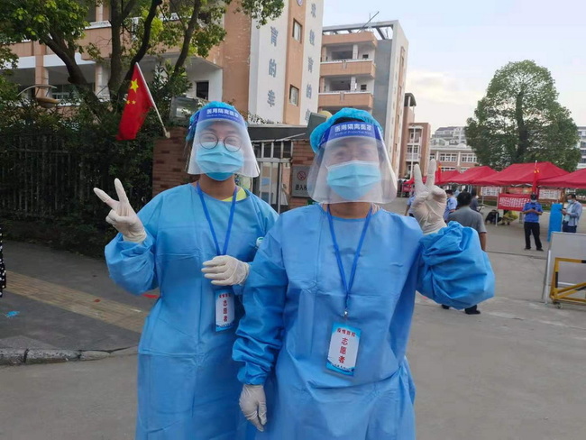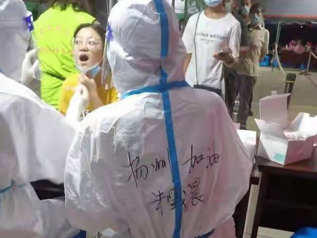 8月9日,扬州市江都区启动了第三轮全员核酸检测。天刚蒙蒙亮,扬州市江都区仙女镇龙川小学的教师志愿者们就来到了李坝、南吴两个社区的核酸检测点开展志愿服务,不少教师子女也自发地加入到了志愿者的行列之中,与他们的父母并肩作战,帮助检测点帮助维护秩序,协助医护人员进行信息录入,成了核酸检测点的一道亮丽的风景线。