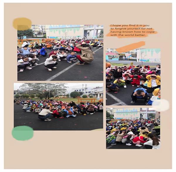 活动前,各班级老师告知幼儿“地震来时,不要慌”,并指导幼儿紧急避险的方法,如:迅速抱头、弯腰;躲在墙角或桌子底下等。随着演练时间的正式开始,各班级老师组织幼儿根据疏散路线,迅速有序地从安全通道紧急疏散到室外安全空旷的操场。整个演练过程有条不紊按活动方案进行,各班老师在整个演练过程中,始终密切关注幼儿安全,确认幼儿无任何伤情后,向园长汇报各自班级幼儿撤离的情况。