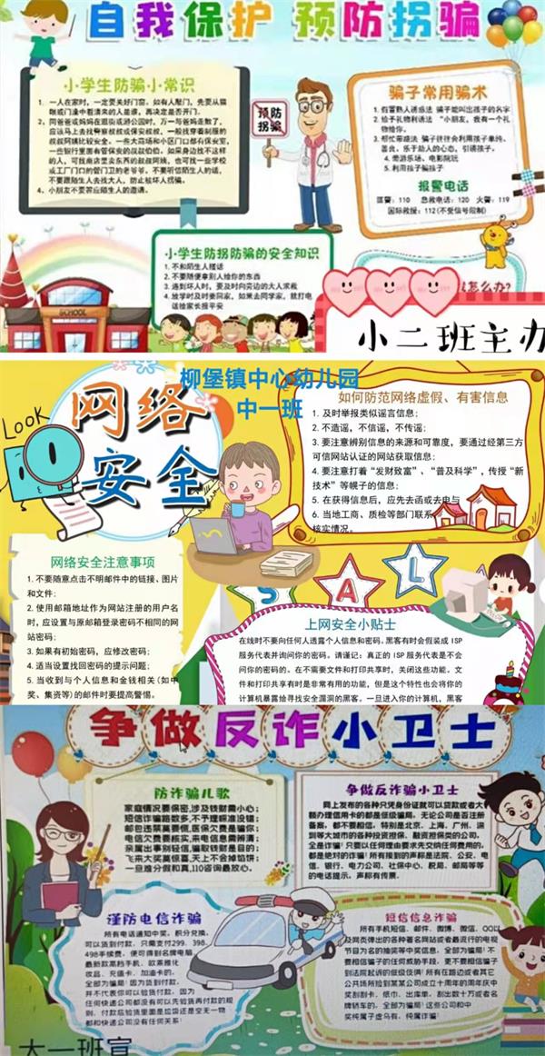 2021〕51号《关于开展防范电信网络诈骗集中宣传活动的通知》通知精神,日前,柳堡镇中心幼儿园园长冯秀华对文件进行了细致的学习及研读,开展了系列活动。该园通过电子显示屏标语宣传、开展 “小手拉大手,共筑防骗墙”防电信网络诈骗活动,各班还组织幼儿观看防诈骗动画片教育、防诈骗宣传展板、微信班级群、致教职工及家长的一封信等形式,提醒大家做好日常防范,让全园师生以及家长进一步增强自我防范意识,共同提高识骗防骗能力。