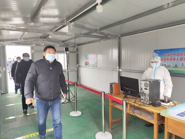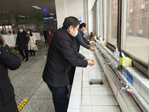 在李兆兵书记和盛传云副校长的带领下,此次演练人员一行近三十人,从学校东南大门等候区排队进入到校园内,先经过测温分流通道,进入到测温棚内测温。人员再分流进入到主教学楼一一毓贤楼和学海楼教室内;若测温发现有身体异常人员,则带入到学校北边的三个隔离室之一。参加演练的教职工还列队来到食堂一楼、二楼餐厅内,大家在餐厅内演练了"六步″洗手、排队取餐盒、用餐等场景。