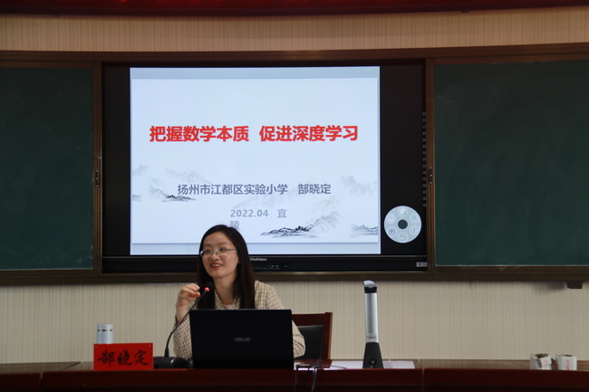 首先,江苏省特级教师郜晓定对本次上课的两位老师的精彩呈现予以了充分的肯定,并分享了以《体现数学本质 进行深度教学》为题的40分钟作业评价微讲座。郜老师以“双减”政策为根本,从教学设计、学习材料、教学引导等方面进行讲述,她认为抓住了数学本质,据此在体现儿童主体条件下设计教学、实施教学,就能最大程度地促进学生深度学习,进而提升数学素养。