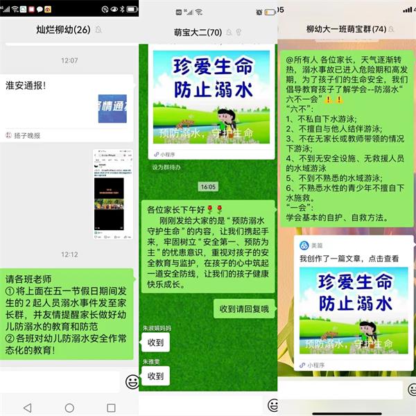 五、通过微信群、美篇、电子显示屏循环播放宣传标语等向家长定期发送周末安全提醒、假期安全提醒、溺水事故安全警示提醒,引起家长对幼儿防溺水安全监管的重视。