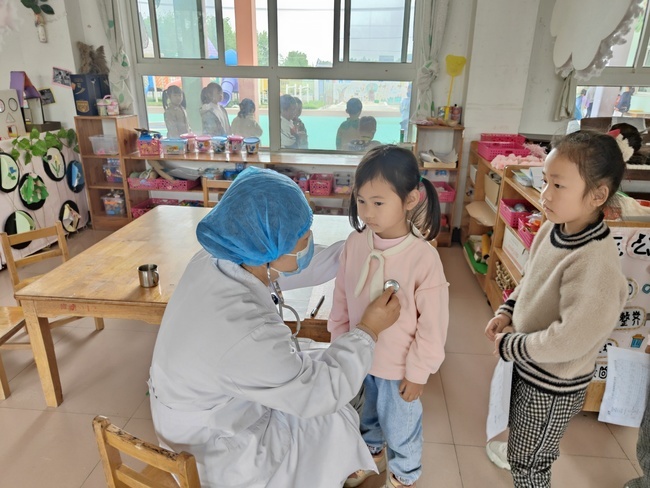 近日,宝应县柳堡镇芦村幼儿园来了一群特殊的客人,她们是柳堡镇中心卫生院的医护人员,瞧,她们给孩子们提前送来了‘六一”礼物——健康检查。