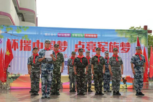 初升的朝阳亲吻着少年坚毅的脸庞,笔挺的军装勾勒出少年挺拔的身姿。6月13日一早,龙川小学四年级六百余名学生聚集在操场,举行了该校的第八期少年军校开营仪式。