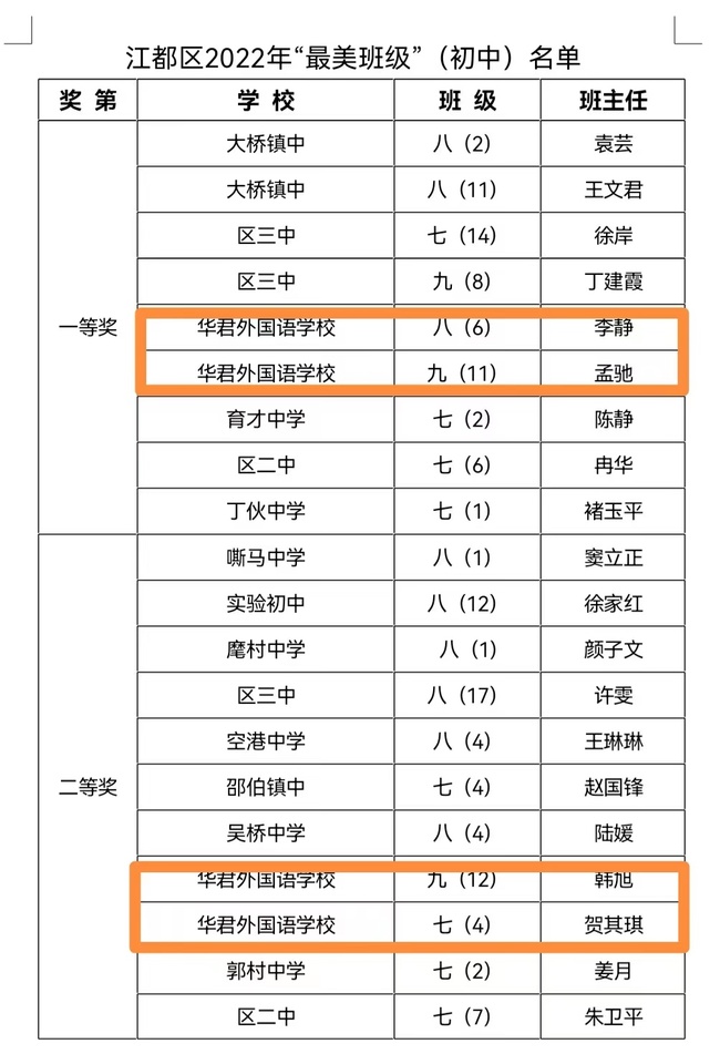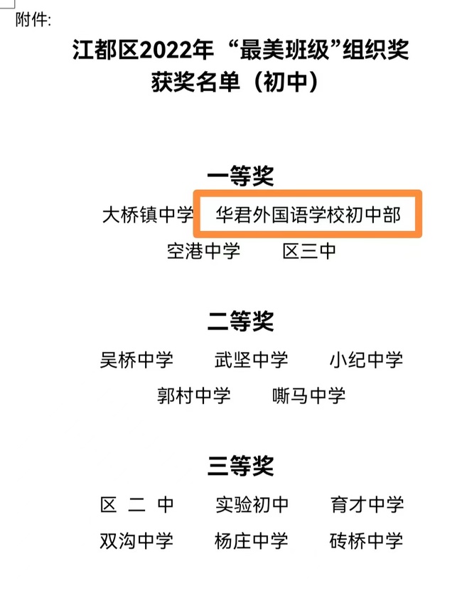 近日,江都区教育局颁发了《关于公布2022年“最美班级”评审结果的通知》,华君外国语学校初中部荣获组织奖一等奖,另有四个班级分获江都区一、二等奖。