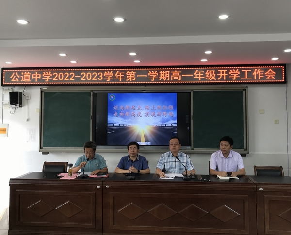 新起点,新征程,新高度,新跨越。新的学期,用心出发。为协调安排新学期高一年级的各项工作,明确奋斗目标,8月29日上午,公道中学高一年级在毓贤楼阶梯教室召开了2022-2023学年秋学期第一次全体教师会议。公道中学党总支书记、校长李兆兵,高一年级负责人颜鹏,高一年级主任彭志群、副主任葛俊,以及高一年级全体教师出席了会议。会议由彭志群主任主持。