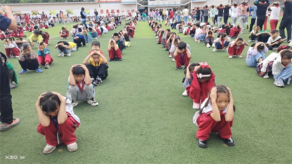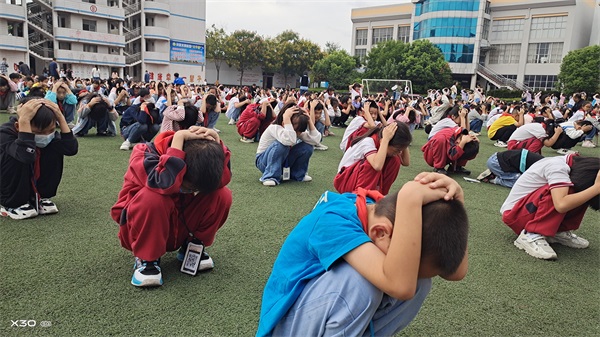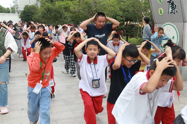 演练前,学校少先队制定了详细的演练方案。随着第一次警报拉响,老师们迅速反应,立即组织学生紧急避险;随后第二次警报声响起,师生开始应急疏散,只见学生们弯腰低姿,双手抱头,迅速有序疏散至集合点。整个疏散过程安全有序。