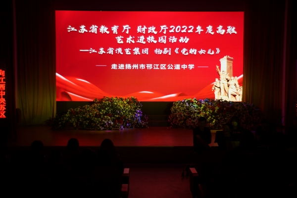 9月26日晚,江苏省教育厅、江苏省财政厅2022年高雅艺术进校园活动——江苏省演艺集团扬剧《党的女儿》走进扬州市邗江区公道中学,为师生们带来了一场精彩的文化艺术盛宴。扬州市邗江区教育局副局长沈文涛,体卫艺科科长崔如艳、体卫艺科嵇秀娟老师,江苏省教育厅高雅艺术进校园项目评估办丁小兵,邗江区公道中学党总支书记、校长李兆兵、全体校务会议成员和公道中学近400名师生一同观看了演出。