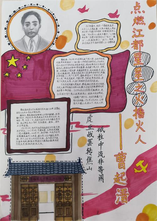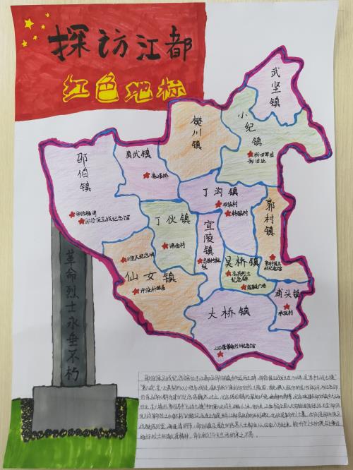 围绕家乡的红色文化遗址,家长带学生自主设计一次“重温百年光辉 传承江都红色印记”的红领巾寻访研学之旅,鼓励学生创作有关江都红色文化的主题绘画、书法、剪纸作品、手工作品等,鼓励学生用手机拍摄视频并附简短的介绍发班级群或朋友圈。