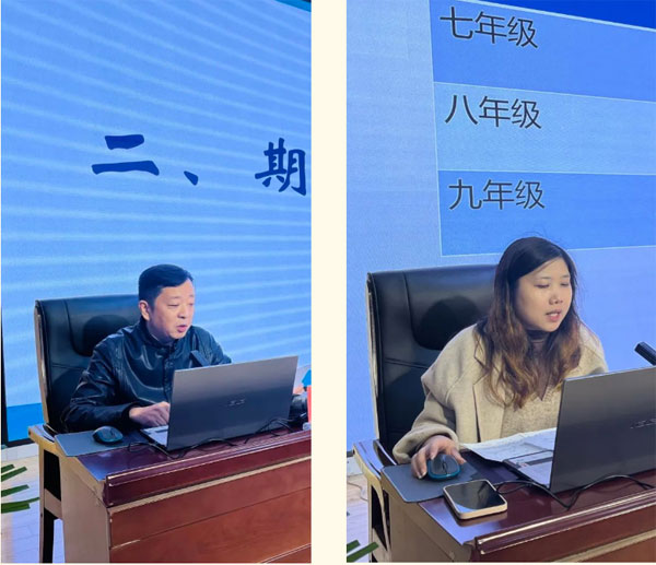 会议第一项议程是由朱小勇书记和张美副校长分别就小学和初中两个学部半学期以来取得的成绩和不足进行系统总结和分析。