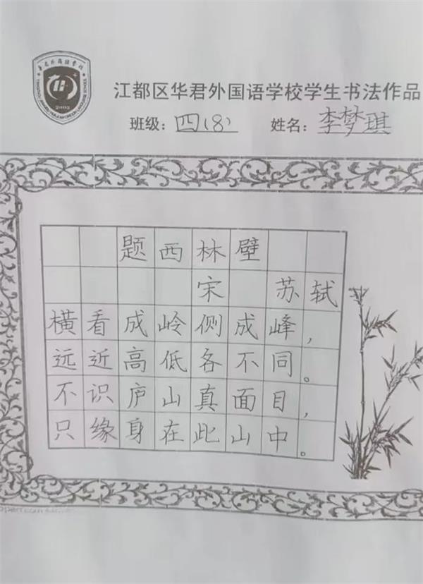 最是书香能致远,笔墨丹香展英姿。江都区华君外国语学校为弘扬中华优秀传统文化,培养学生的书写习惯,语文组在开学初制定了书写童子功训练方案。 开学至今,语文组的老师们不仅在课堂上悉心讲授书写要领,还利用课余时间一对一指导,力争每一个孩子都能在书写上得到很大的提升。