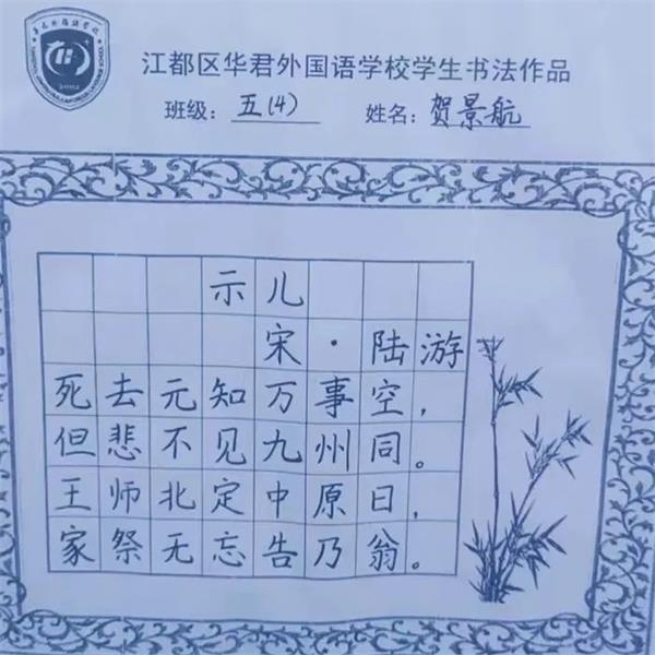 江都区华君外国语学校全体语文老师参与了本次书写童子功作品的评审,经过认真审查,精心挑选,每个班级评选出了十份优秀作品。孩子们的书法作品或端庄秀美,或灵动洒脱,为我们呈现了一场书法的视觉盛宴。