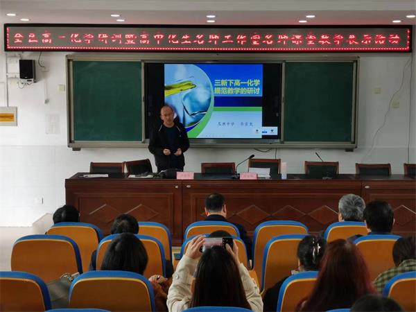 随后,扬州市化学学科带头人孙安龙老师作了《三新下高一化学规范教学研讨》专题讲座。孙老师针对高一学生在之前的期中、期末考试中不能规范答题的情况,分析了原因,并建议教师在平时教学中要注意规范化,要辩证的看待试题与答案,注重答题的程序化,注意答题的全面化。同时,关于实验方案的书写,孙安龙老师强调在实验方案设计中要注意方案的可操作性,实验中是怎样具体操作的,不能简单的描述为等量、等浓度等模糊操作。