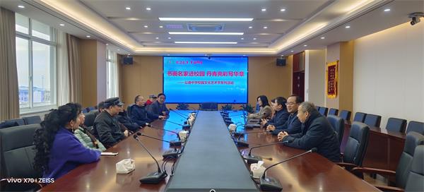 活动开始,在公道中学党总支书记、校长李兆兵、副校长盛传云、校长助理吴爱华、艺教处主任吴文娟等人的陪同下,6位书画名家参观了校园,并在会议室听取了李兆兵校长关于公道中学“文艺并进 双轮驱动”的办学特色及学校近几年艺术取得的成果汇报。书画家们纷纷感慨:公道中学的艺术教育特色影响力日益增强,学校的美育成果斐然,校园文化高雅、脱俗。