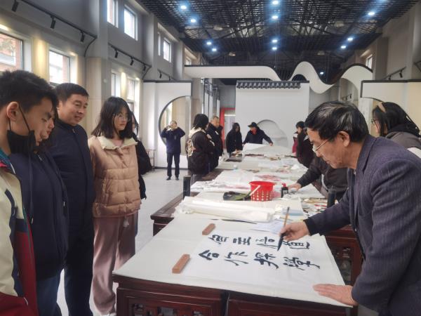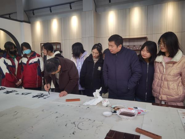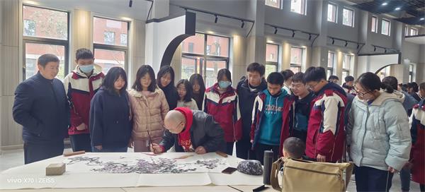 面对学生们的提问,书画家们耐心地向同学们介绍创作过程中的经营位置、落笔起势、虚实呼应等相关专业知识,让同学们在书法创作的点、横、撇、掭中感受汉字的变幻创新;在国画创作的纵、横、涂、抹中体悟美术的异彩纷呈。同学们的积极互动也激起了书画家们的创作热情,用手中的笔墨为学生送上祝福的话语。