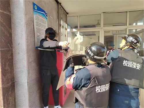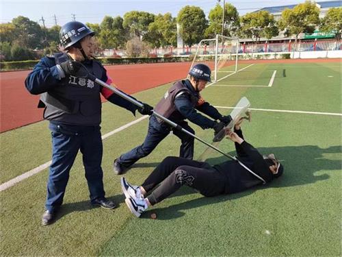 模拟场景一:一名由体育老师扮演手持凶器的“歹徒”强行要闯入校园,2名保安人员迅速手持防暴器械阻止,门卫按响传达室内的公安联网一键报警装置并报告龚宜和校长,安保处工作人员同时疏散学生撤离,齐心合力迅速将”不法分子”制服,成功保护了师生生命安全。