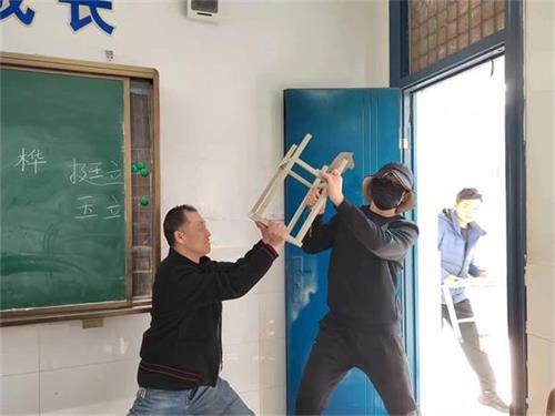 模拟场景三:“歹徒”在四年级一班行凶未果后,准备上楼,黄老师和石老师在楼梯口用凳子堵住了楼梯口,并用拖把与“歹徒”进行搏斗,安保人员和民警迅速赶到事发现场,与老师们一起将“歹徒”制服并带离。