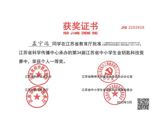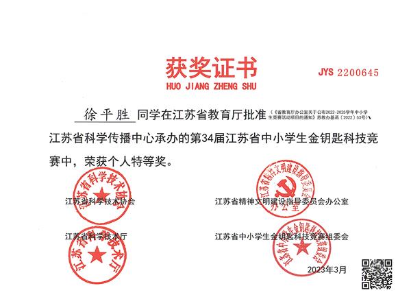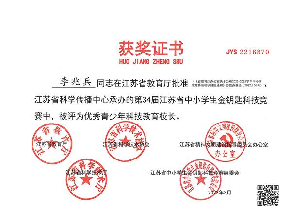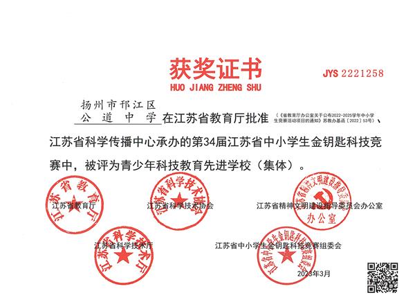 在第34届江苏省中小学生金钥匙科技竞赛中,公道中学再获佳绩。9位参赛学生获得省级奖项。徐平胜同学获得省个人特等奖,孟宁远、吴义凯同学获得省个人一等奖,陈徐阳、费彭程、冯致扬、黄宇、吴烨、张宇文等6名同学获省个人二等奖。公道中学再次荣获省“青少年科技教育先进学校(集体) ”;李兆兵校长被评为省“优秀青少年科技教育校长”;陈志林、张强老师被评为省“优秀青少年科技教育辅导员”。