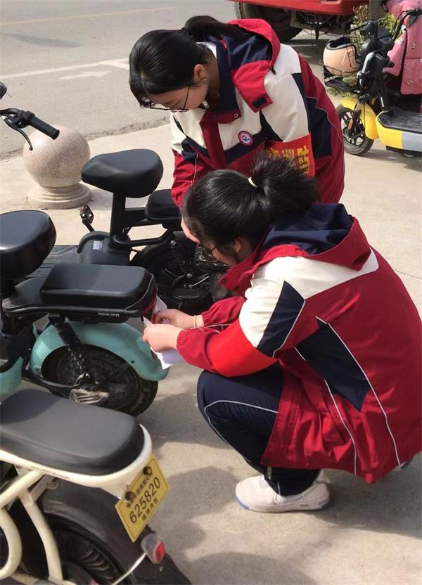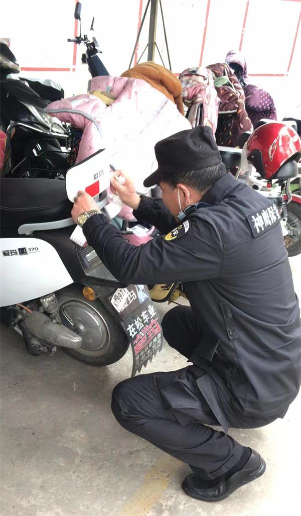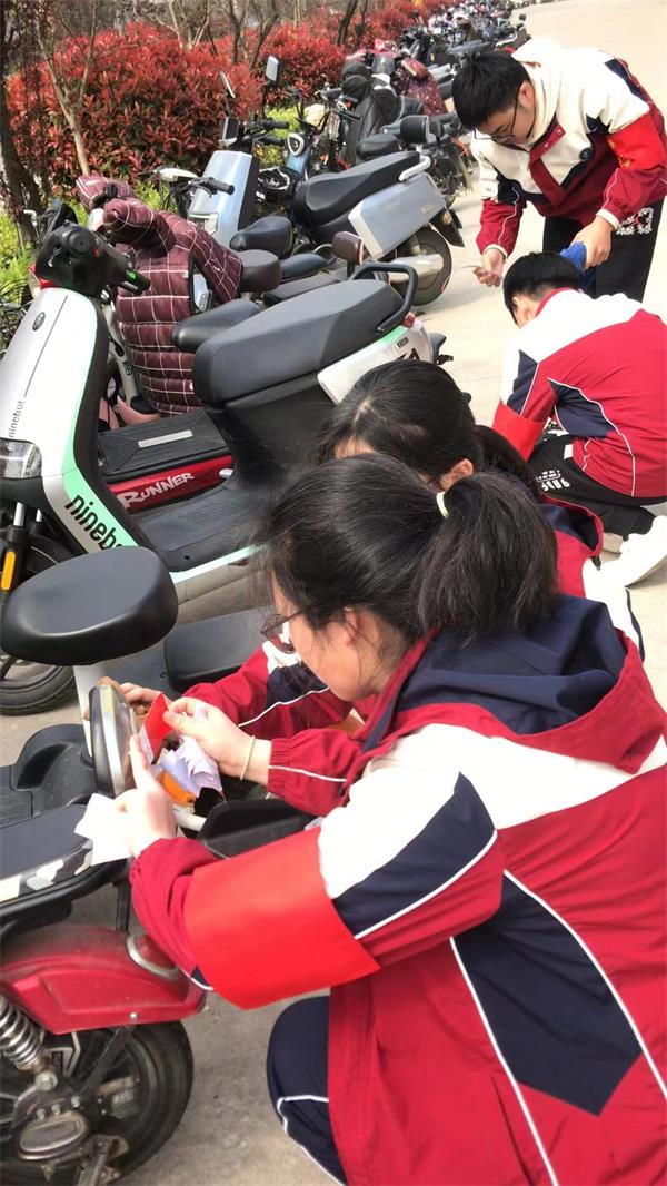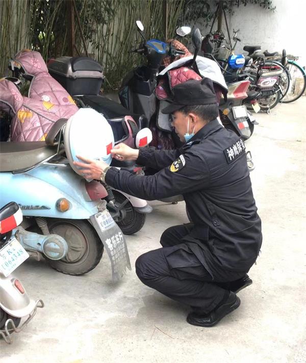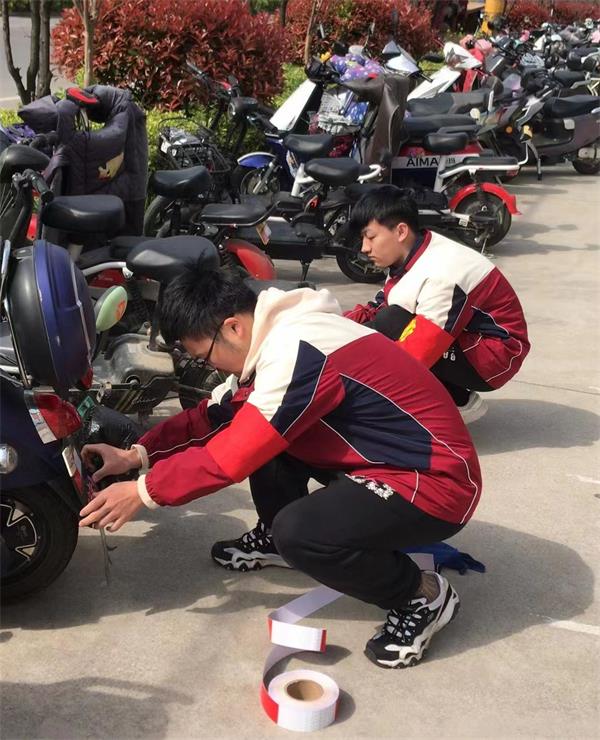 最后为了进一步筑牢校园安全体系,确保师生生命安全,在大课间休息时间,校园保安和文明先锋队共同为校园内非机动车贴上了反光贴,为校园师生安全送上一份呵护。