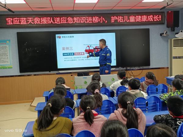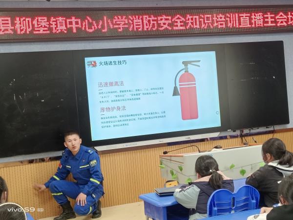 演练前,宝应蓝天救援队周健教官在录播教室通过直播的形式为全校师生作了《消防安全教育》知识讲座,通过播放事故现场图片、视频、PPT、文字表述等多种途径,结合消防基础知识、消防设施、火灾逃生方法、灭火小妙招、观看戗牌等内容,让学生们知道了火灾、地震的危害,学习了应急避险的处置方法。