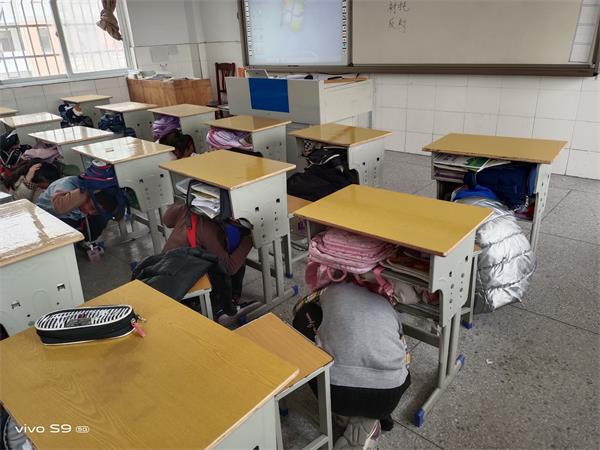 下午15时30分,各楼梯口负责人、各楼道引导员、各位班主任和科任老师提前到达自己的点位,严阵以待,按照各自岗位职责做好安全演练准备工作。15时40分,第一声警报响起,防震应急演练正式开始,此时,在班上课的老师立即组织同学们停止正在进行的活动,一楼的老师以最快速度指挥学生躲避到校园安全区域,并引导学生快速抱头,蜷曲身体,降低身体重心,尽可能保护头部。其它楼层的学生迅速抱头下蹲,弯曲身体就近躲避在课桌下,尽可能用书包等物品保护好头部。