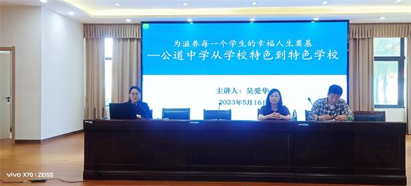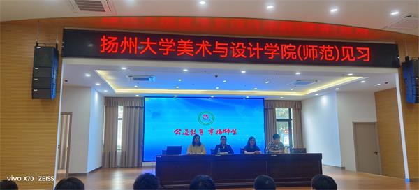 首先,吴爱华校长助理代表公道中学对全体学生表示热烈欢迎。她开设了主题为《为滋养每一个学生的幸福人生奠基》的讲座,介绍了公道中学学校办学理念、课程设置、环境介绍、特色活动和成果展示。她希望扬州大学的同学们通过这次见习,能近距离感受到公中艺术教师的风采,让学生们在“美育”的熏陶、浸润和滋养下成为更“美”的自己。